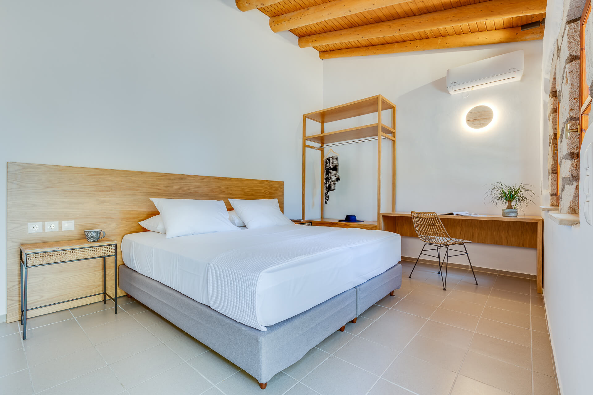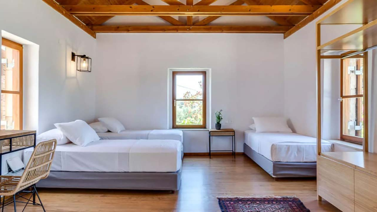 Accommodation is included in the price of the residency, with Premium Rooms located onsite at the Armonia Retreat Center in the peaceful village of Dhouliana, Crete. These rooms blend rustic charm with modern comfort, featuring warm wood accents, natural stone details, and abundant natural light that creates a calm, restorative atmosphere. Offered as a double (1) or triple (2) with a private ensuite bathroom, you will be sharing with one or two other participants, and we are happy to help organise room pairings. Despite the larger occupancy, these Premium Rooms are more spacious and filled with even more natural light, offering both comfort and a sense of openness throughout your stay.
