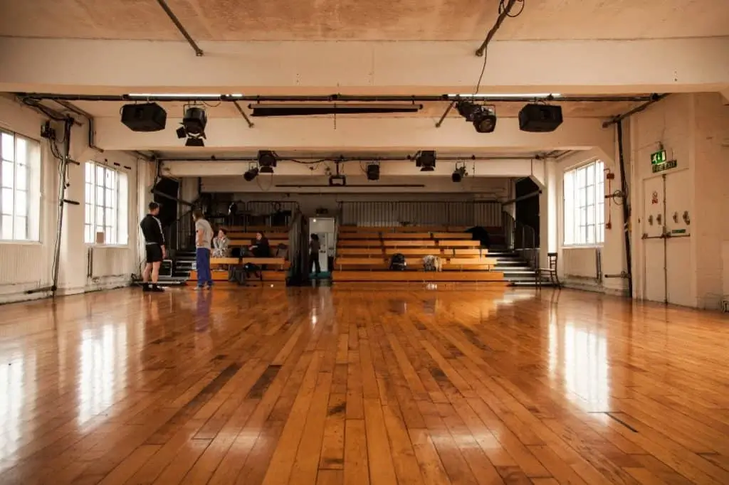 The Performance Studio at Chisenhale Dance Space is a large, bright studio available for hire within an artist-led dance and performance venue in East London. It measures about 10 m × 12.5 m with a 3.3 m high ceiling and features a sprung dance floor. The space is suited to movement activities, classes, workshops, rehearsals and small performances, with flexible capacity depending on the type of activity. Shared lounge and kitchen areas are also available, though the studio itself has some restrictions on footwear and equipment. Rental rates vary by user category and booking type.